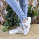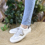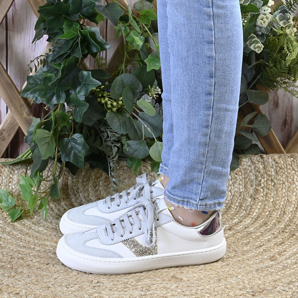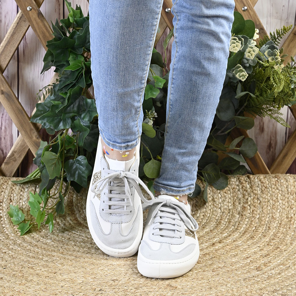 Senda, combina tonos neutros, napa blanca y un serraje gris con piezas de fantasía glitter en el lateral y de efecto metalizado en su talonera.