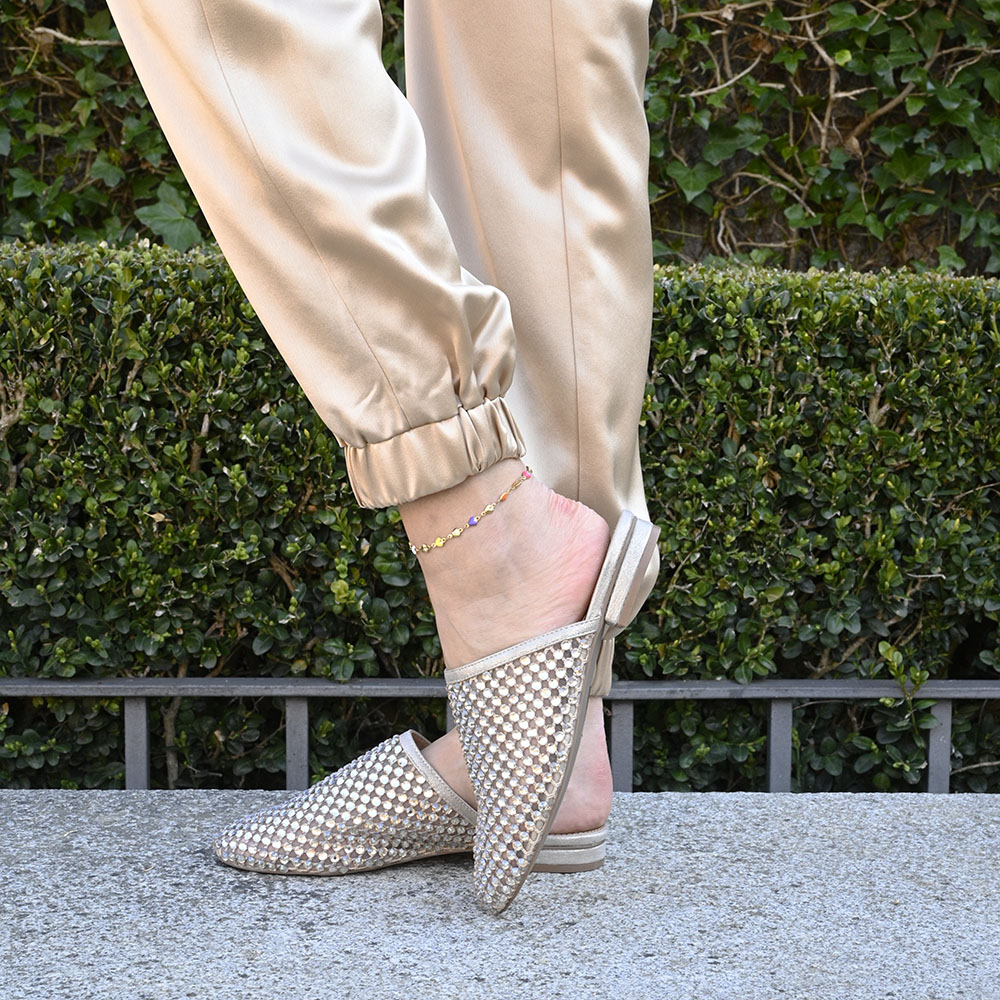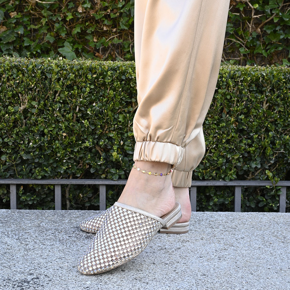 El modelo Sultán no es solo un zapato, es una declaración de estilo. Este mule plano redefine el concepto de elegancia relajada, combinando una silueta clásica con un acabado deslumbrante cubierto por una malla de cristales que capturan la luz desde cualquier ángulo, ofreciendo un brillo sofisticado y atemporal que lo convierte en el protagonista de cualquier conjunto.