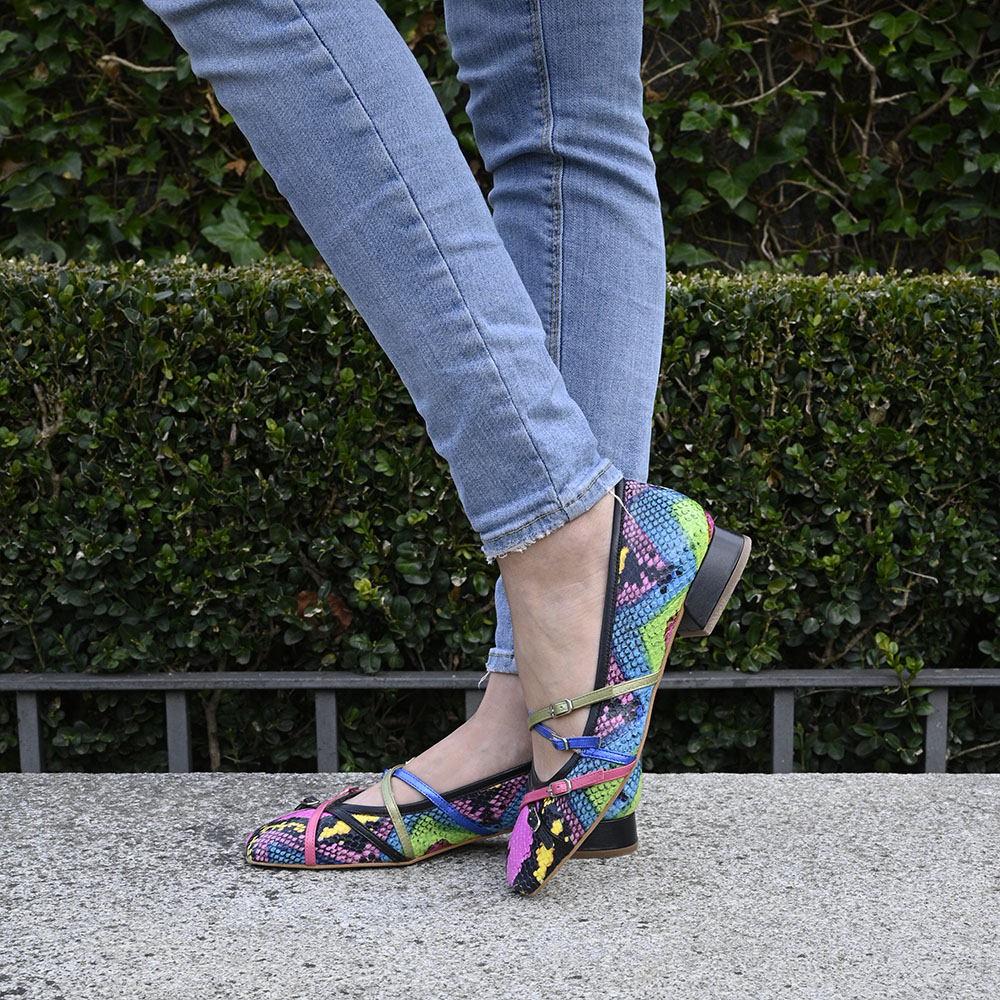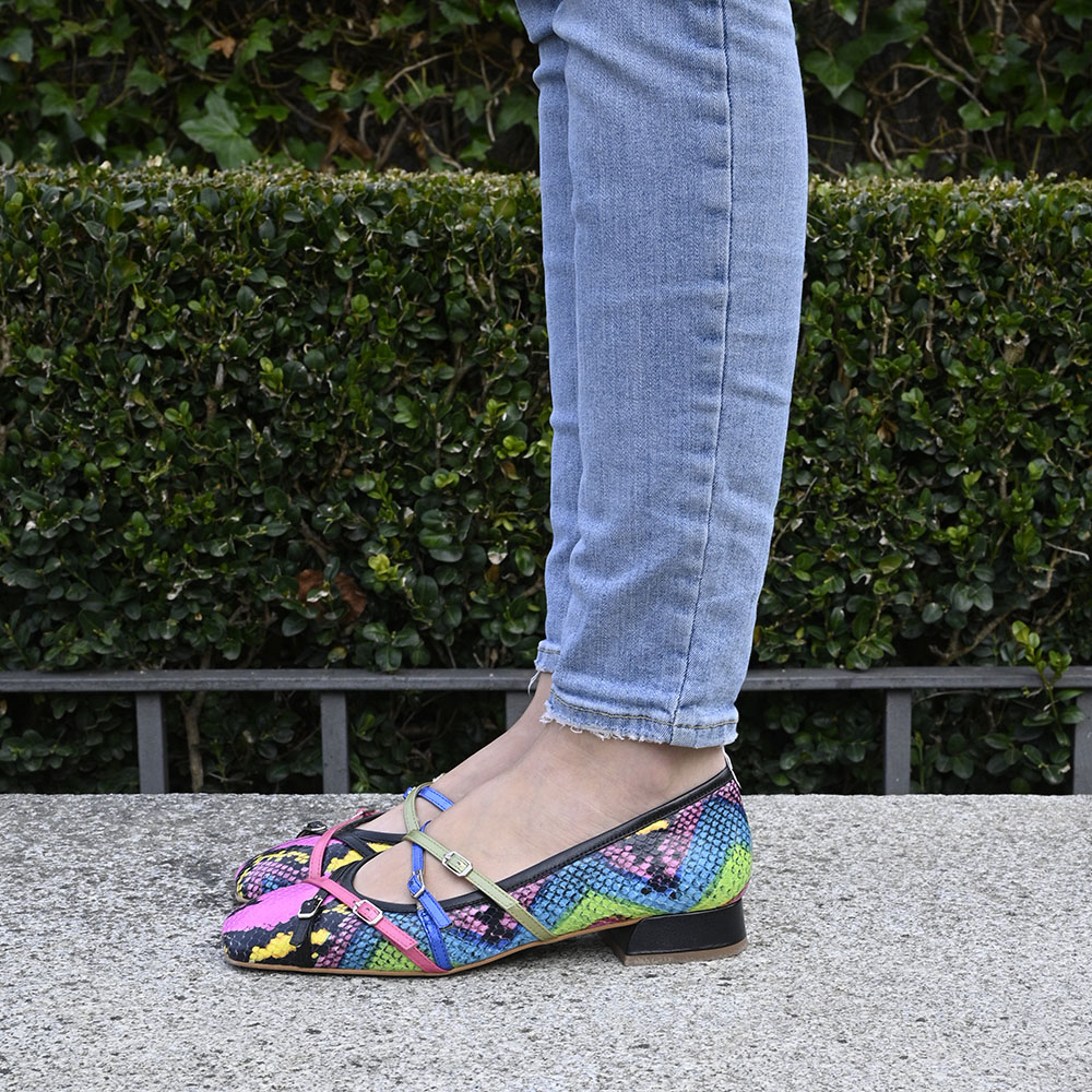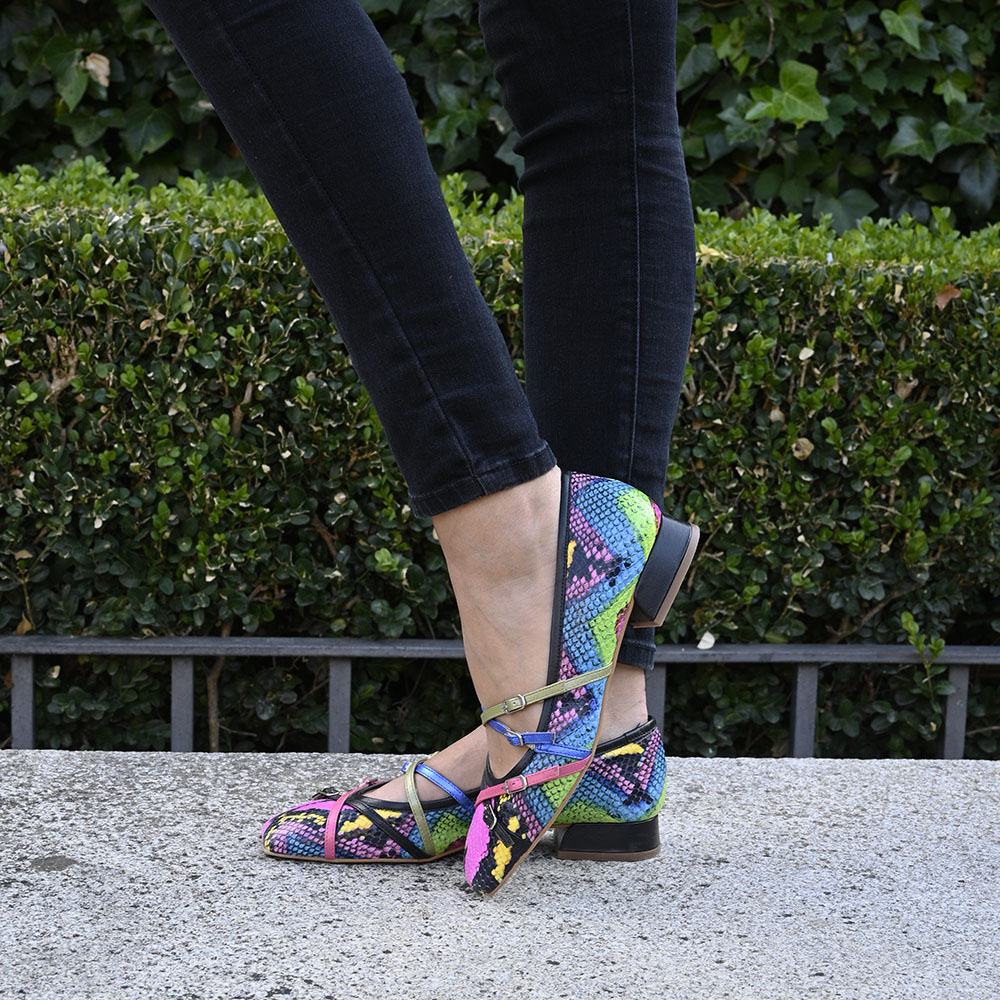 ✔︎ Características: Fabricado en piel con estampado de serpiente en tonos vivos, correas en pieles metalizadas y nacaradas.