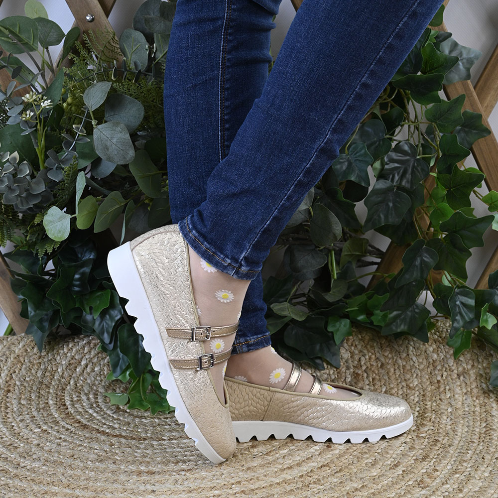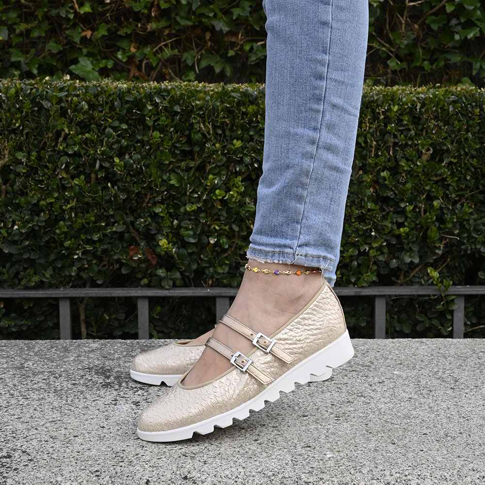 Su exterior es puro magnetismo visual. Está confeccionado en un material con efecto craquelado en tono champán. No es un dorado estridente, sino un brillo texturizado y sofisticado que recuerda a la superficie de una piel exótica. Esta textura atrapa la luz de forma diferente en cada ángulo, convirtiendo tus pies en el centro de atención.