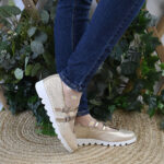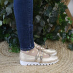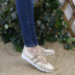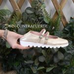 Sin embargo, el secreto de su éxito está en la base: una suela de plataforma blanca con perfil dentado. Esta suela «track» no solo añade esos centímetros extra de altura que tanto favorecen, sino que «aterriza» la elegancia del dorado, dándole un aire deportivo y casual. Es la fusión perfecta entre el glamour nocturno y la comodidad de unas zapatillas deportivas.