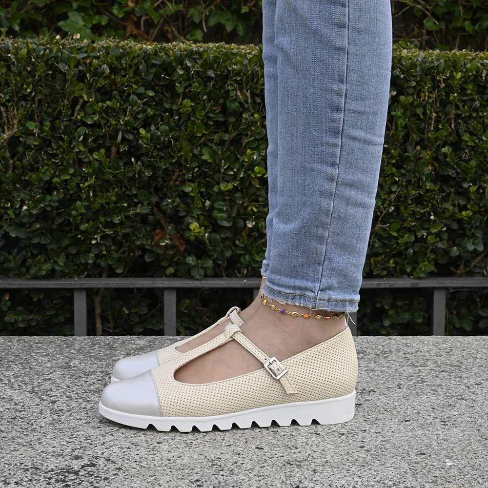 Por un lado, su cuerpo de en piel beige microperforada evoca la delicadeza y la luz del verano mientras te mueves entre reuniones y cafés. Por otro, su puntera en blanco roto con un matiz perlado actúa como un ancla de estilo, un detalle de carácter que rompe la monotonía y define tu personalidad.