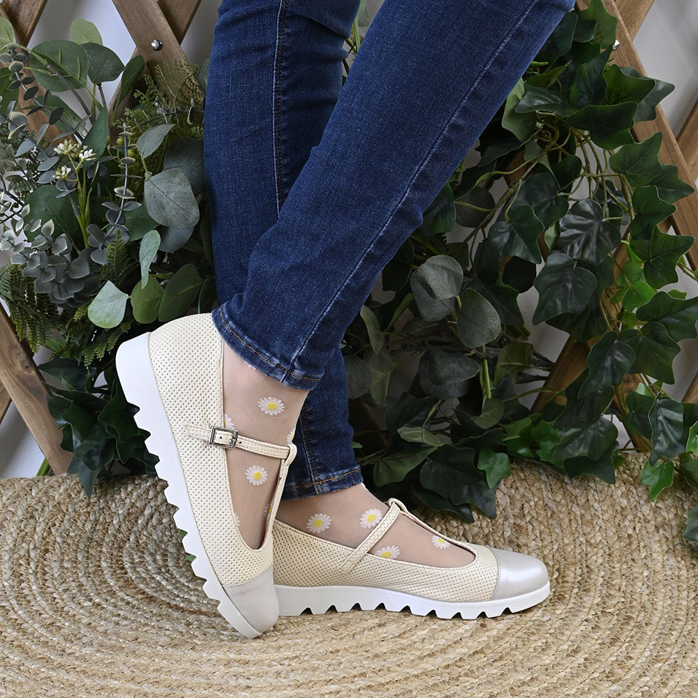 Lo que realmente hace especial a este diseño es su suela. No es solo una plataforma; es una base dentada diseñada para absorber la energía de la ciudad, elevándote literalmente sobre el suelo y protegiendo tu paso con una ligereza sorprendente. Es la sofisticación de una silueta T-bar clásica, pero reinterpretada para una mujer que pisa fuerte y no se detiene.
