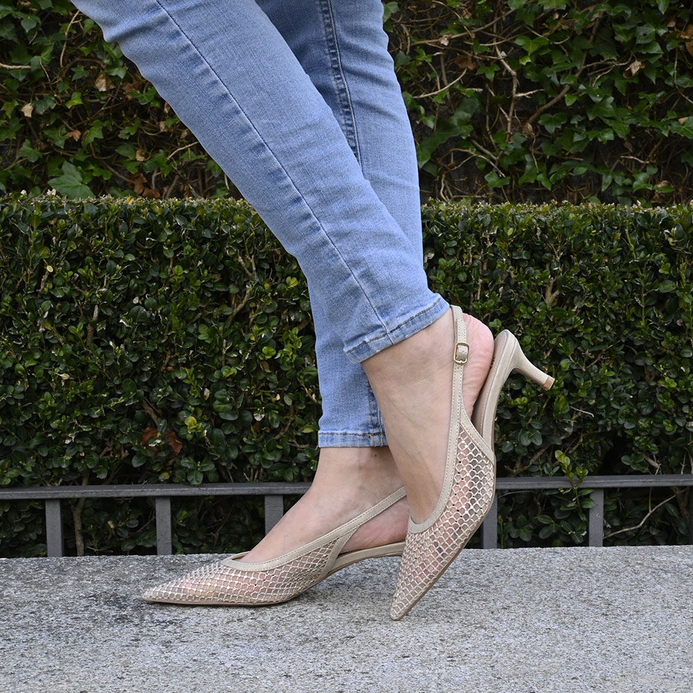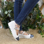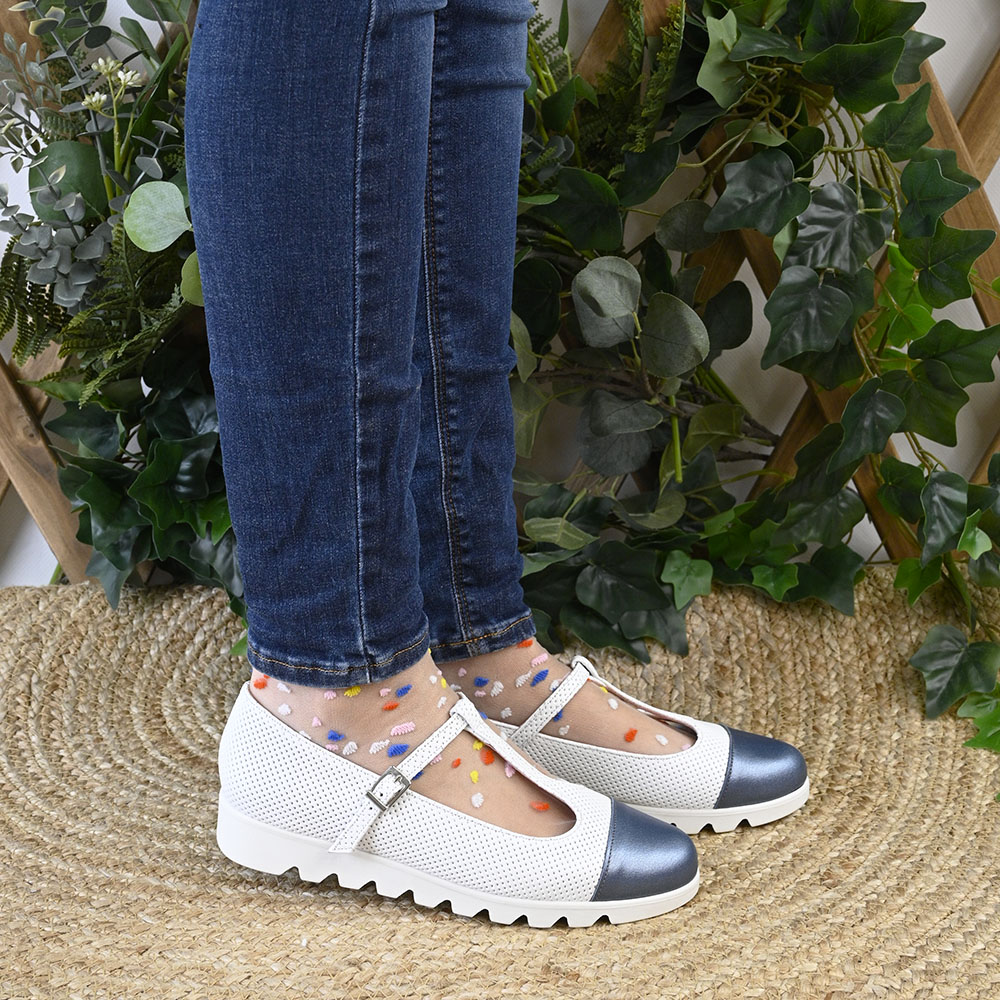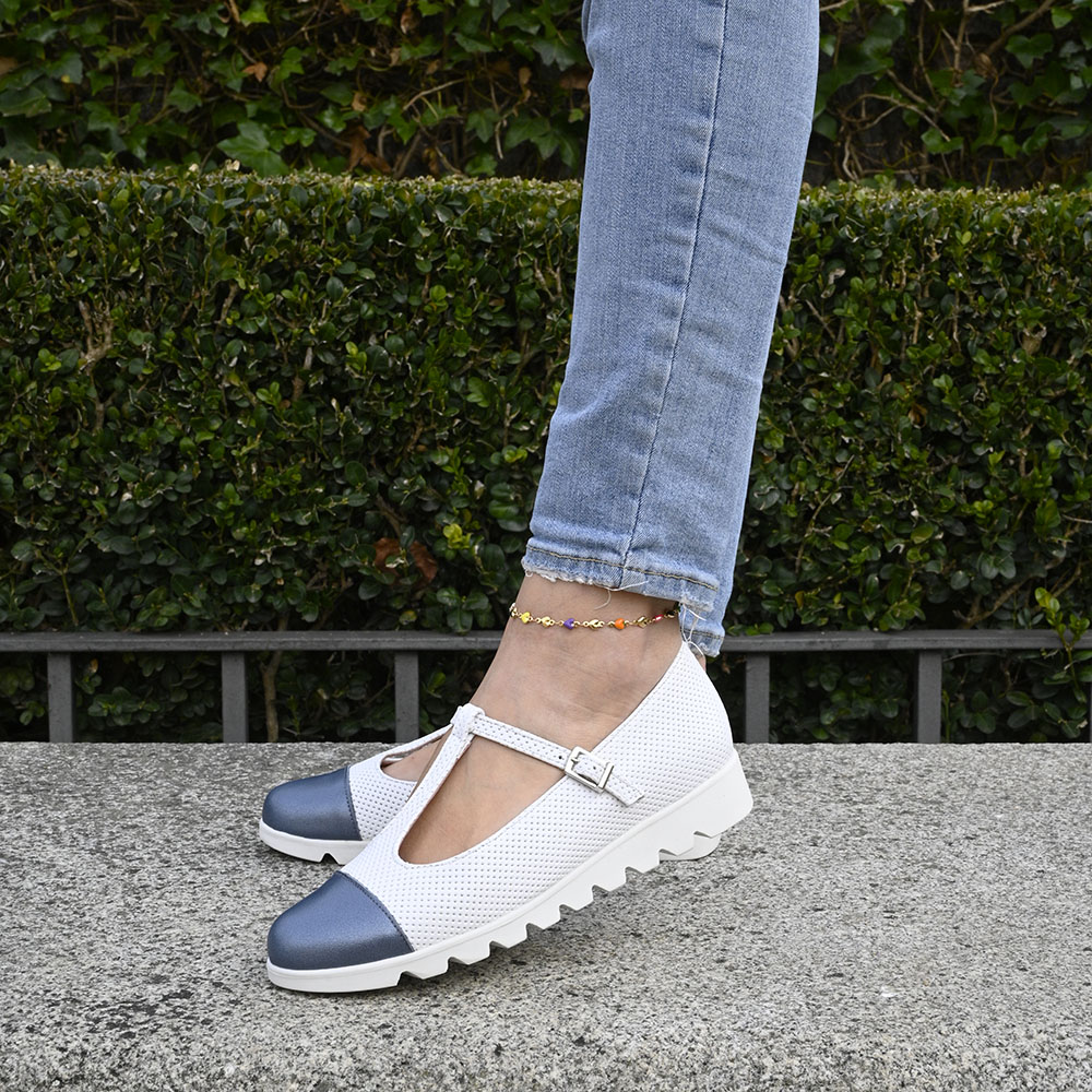 Por un lado, su cuerpo de piel blanca microperforada evoca la delicadeza y la luz del verano mediterráneo mientras te mueves entre reuniones y cafés. Por otro, su puntera en azul cero con un matiz perlado actúa como un ancla de estilo, un detalle de carácter que rompe la monotonía y define tu personalidad.