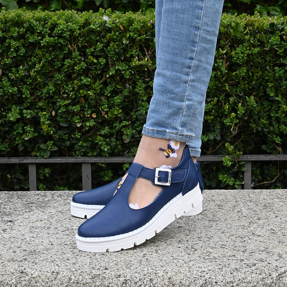 El modelo Laura fusiona el clásico concepto de un zapato T-bar con la frescura de una linea casual y sport, gracias a su suela ultra ligera de estilo deportivo.