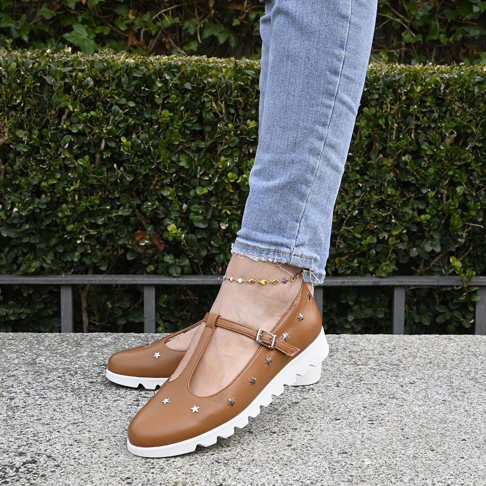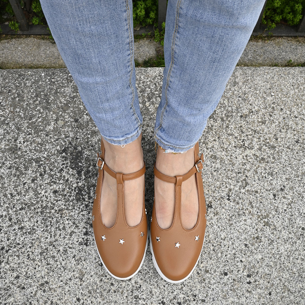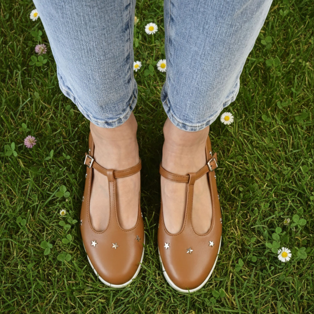Imagina la suavidad de una piel en tono caramelo tostado que abraza el pie con calidez. Pero el verdadero secreto reside en su detalle: una hilera de estrellas plateadas que parecen haber caído del cielo para posarse sobre este diseño, aportando un destello de luz a cada paso que das.