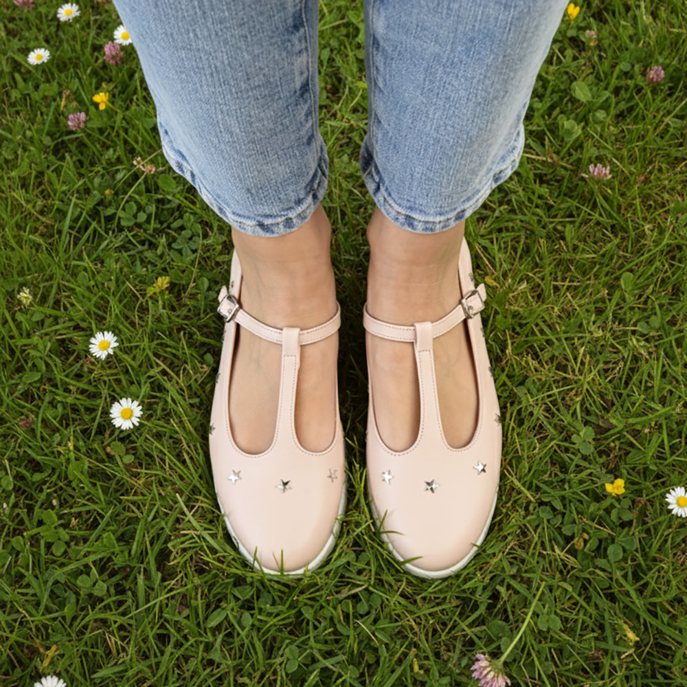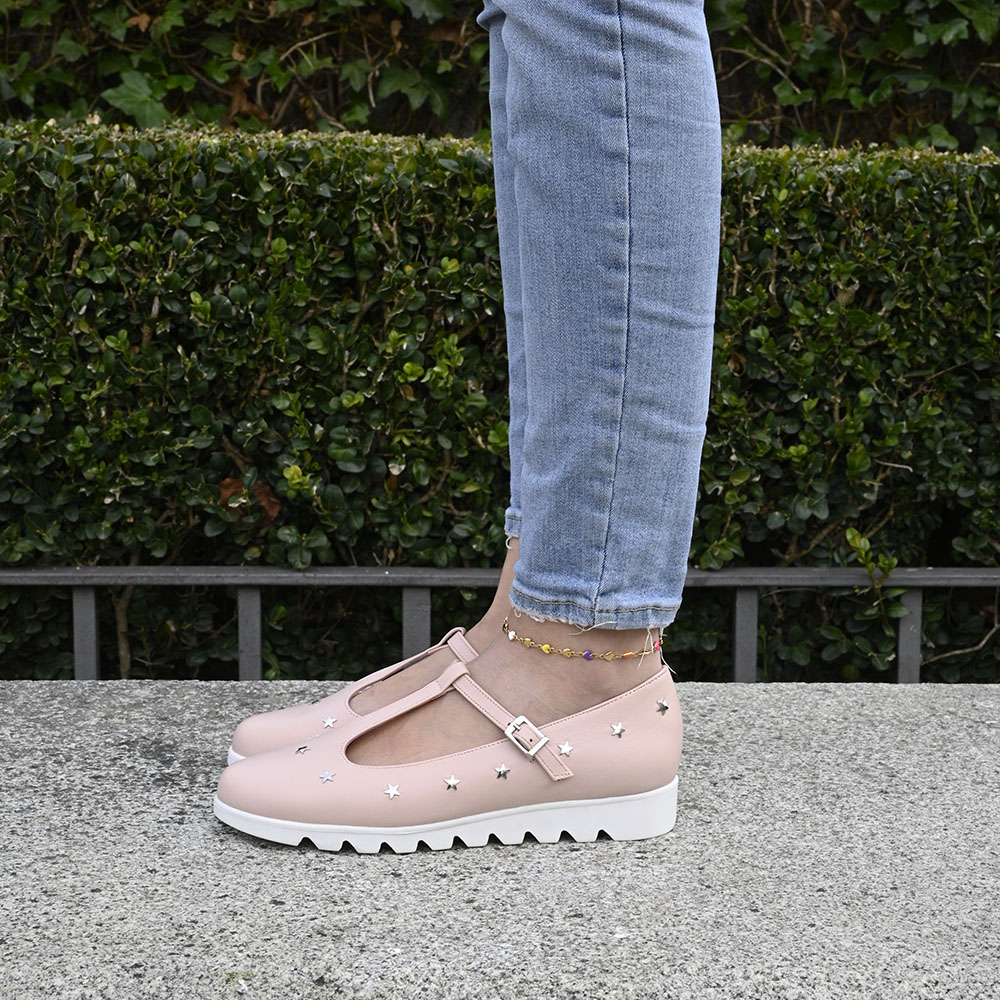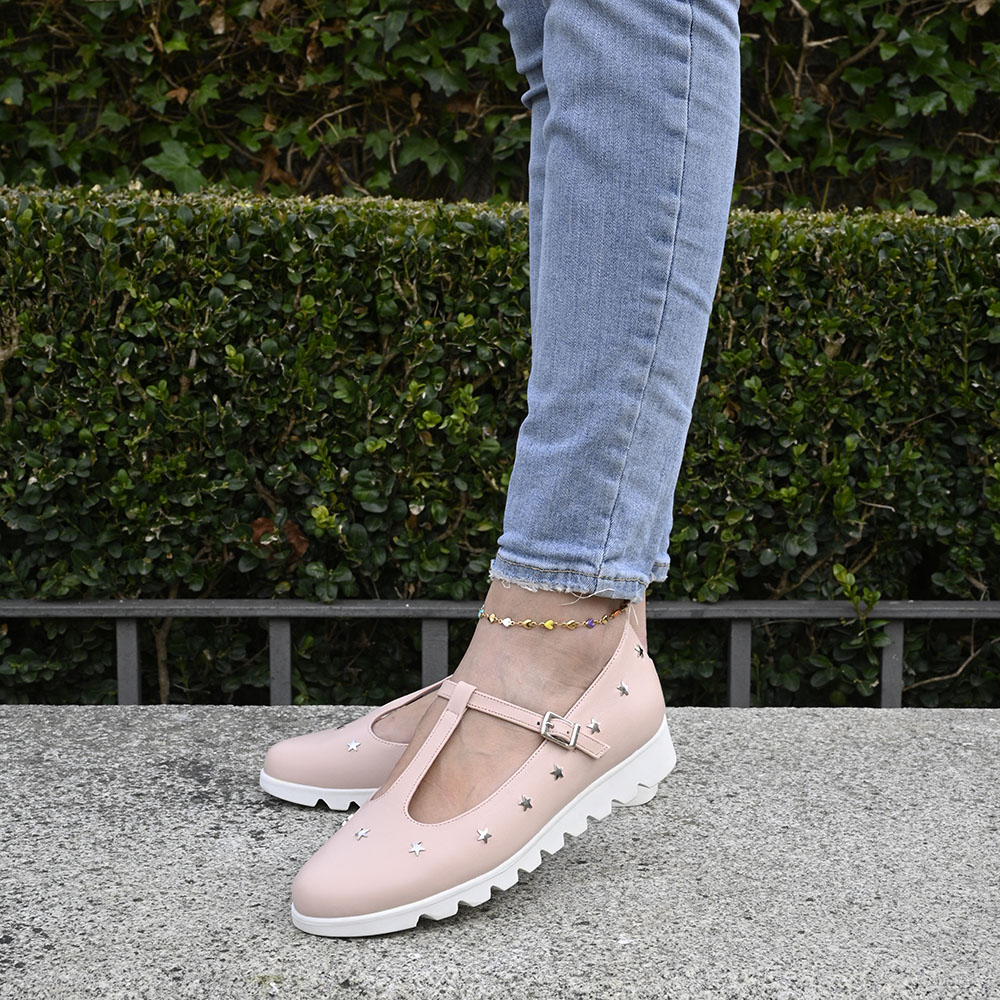 Imagina la suavidad de una piel en tono rosa empolvado que abraza el pie con calidez. Pero el verdadero secreto reside en su detalle: una hilera de estrellas plateadas que parecen haber caído del cielo para posarse sobre este diseño, aportando un destello de luz a cada paso que das.