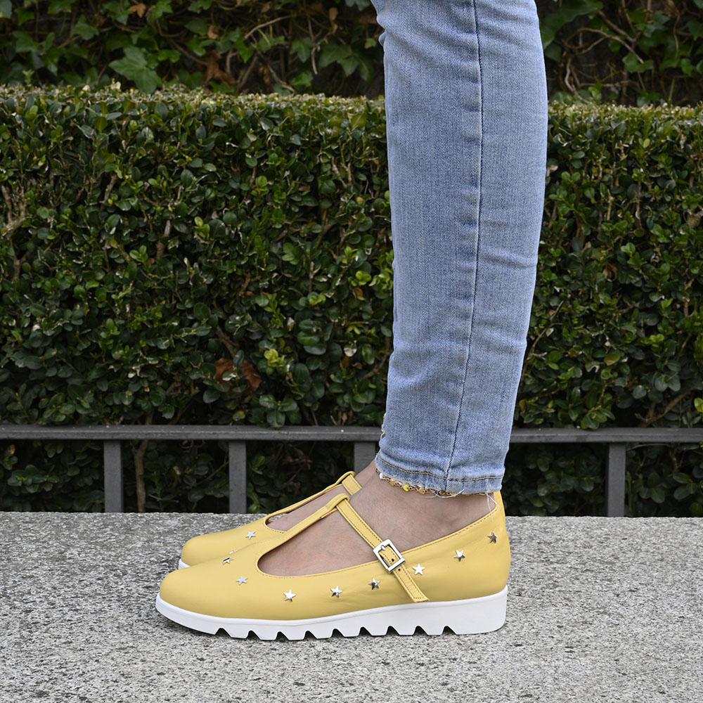 Imagina la suavidad de una piel en tono vainilla que abraza el pie con calidez. Pero el verdadero secreto reside en su detalle: una hilera de estrellas plateadas que parecen haber caído del cielo para posarse sobre este diseño, aportando un destello de luz a cada paso que das.