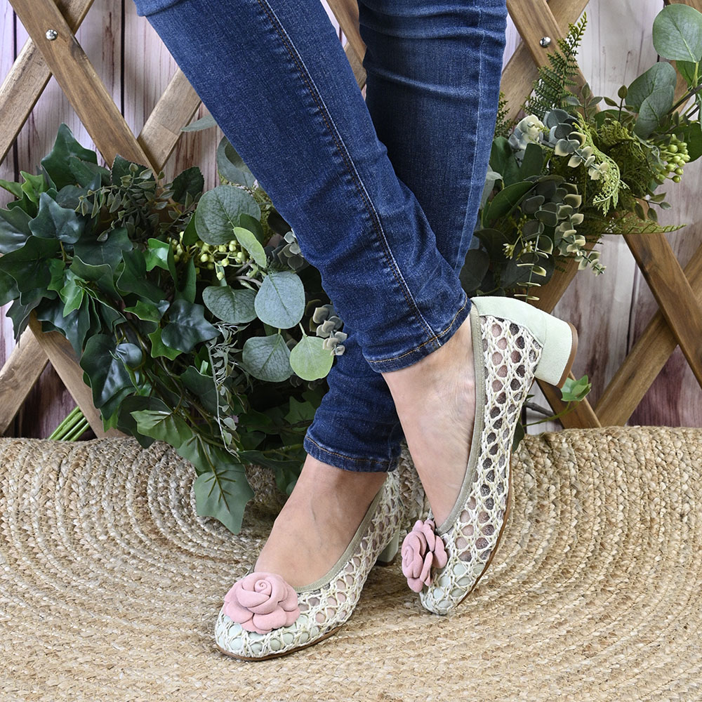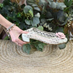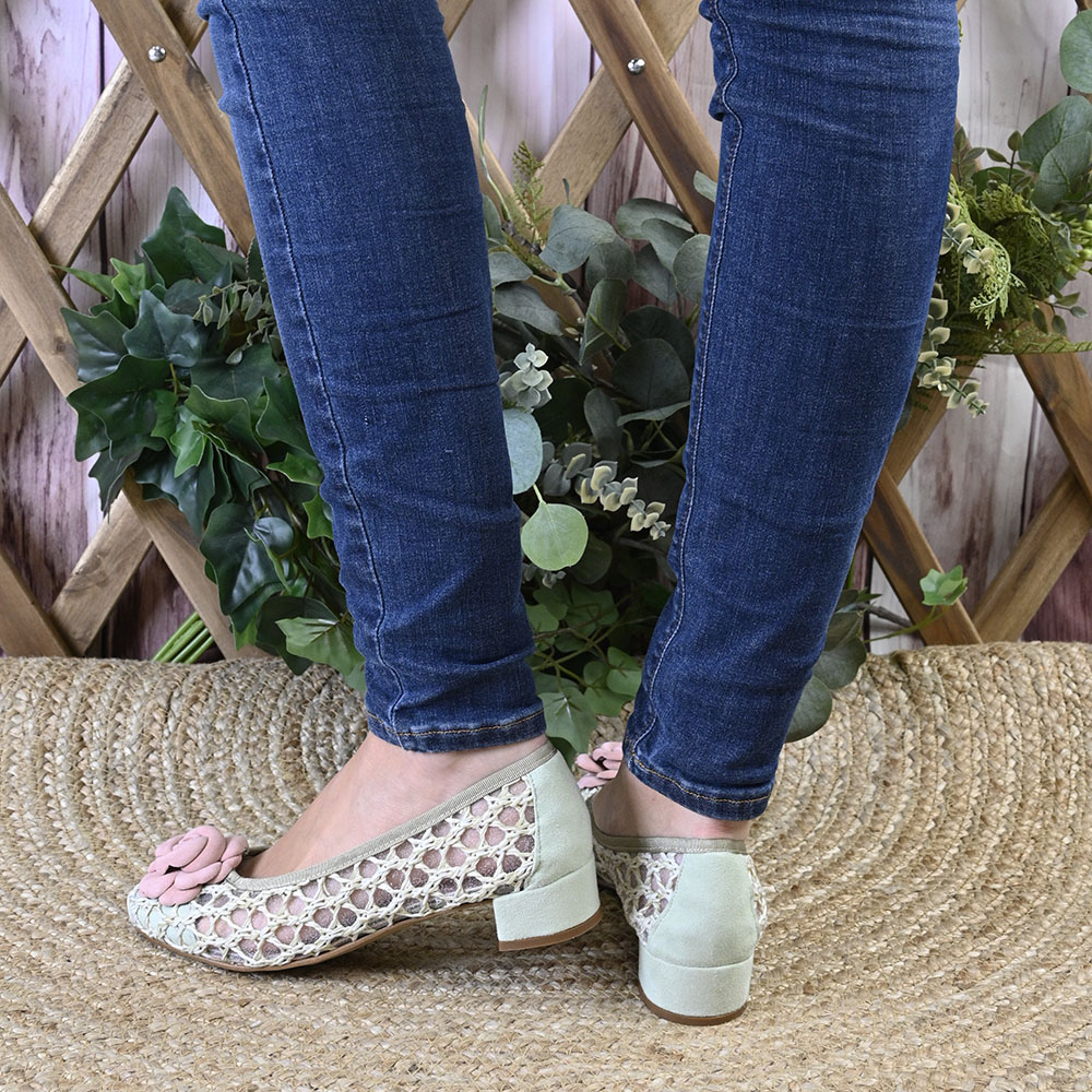 La combinación de sus detalles, en ante verde mint se funde con suavidad aportando ese toque fresco y juvenil. Aunque sin duda, el protagonismo absoluto florece en la puntera con una camelia en ante rosa empolvado.