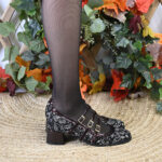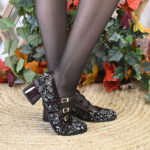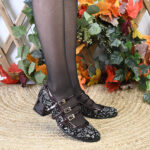 Este modelo es una preciosa fantasía con alma literaria. Está confeccionado en un suave ante negro sobre el cual se ha grabado un elegante motivo floral con tonos tostados, beiges y gris hielo. Combina con un espectacular charol burdeos que enmarca románticamente la silueta del pie. Sobre el empeine cobran protagonismo tres tiras regulables con hebilla y elástico. Y a juego con el mismo charol se viste elegantemente el tacón.