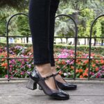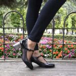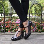 Está realizado en una preciosa combinación de pieles metalizadas en tono antracita con un mágico matiz azulado con puntera, talonera y cinta al tobillo rompiendo en charol negro. Destaca el tacón; pintado con motivos circulares en tono negro y mercurio.