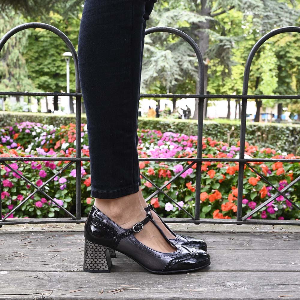 Está realizado en una preciosa combinación de pieles metalizadas en tono antracita con un mágico matiz azulado con puntera, talonera y cinta al tobillo rompiendo en charol negro. Destaca el tacón; pintado con motivos circulares en tono negro y mercurio.