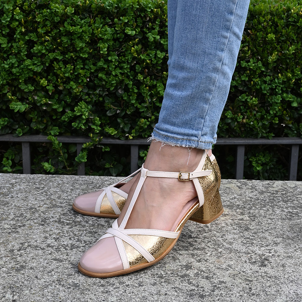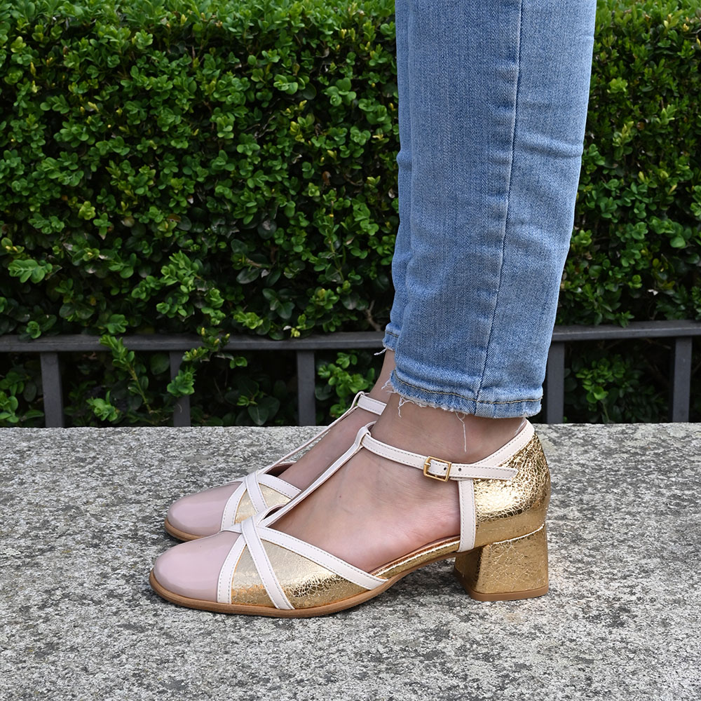 Su estética es sencillamente fascinante. El zapato juega con los contrastes de forma magistral; una puntera redonda en un delicado tono rosa palo acharolado, con un acabado glossy que aporta un brillo sutil y femenino. La tira central que abraza el pie y se une a la pulsera del tobillo, en una piel nude, cierra con un ajuste de hebilla dorada.