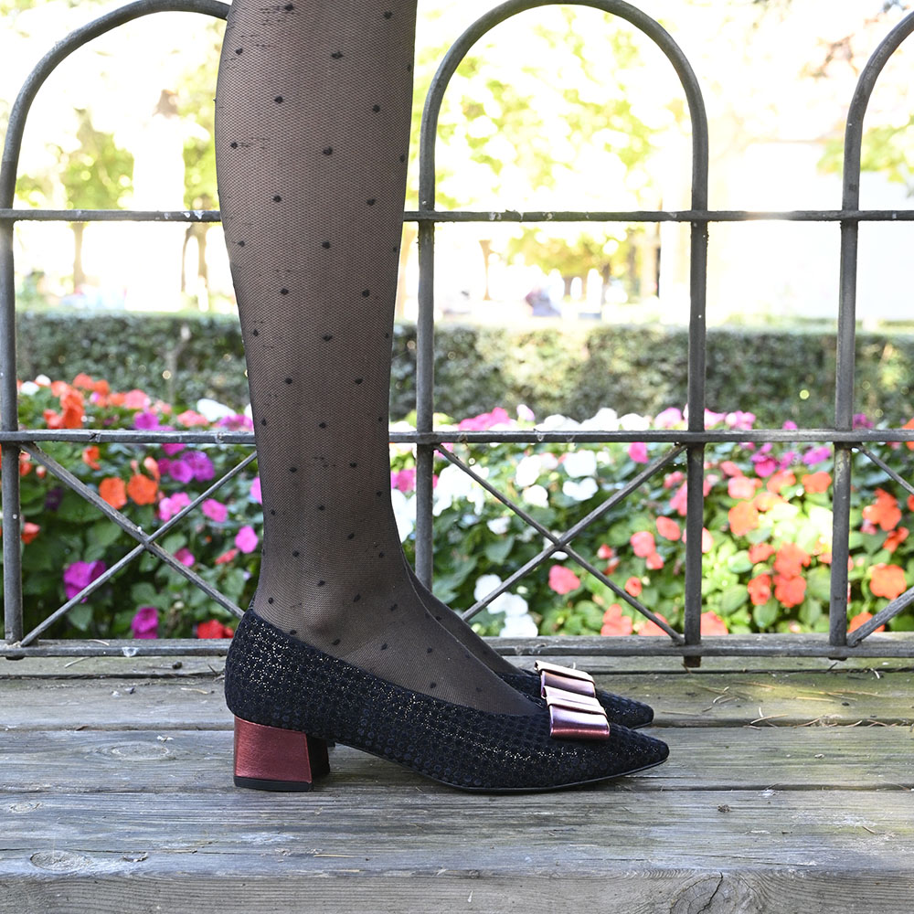 Confeccionado en un amoroso ante negro sobre el cual cobra protagonismo un singular flocado de topitos en terciopelo negro con glitter plateado.