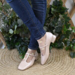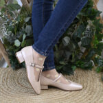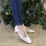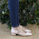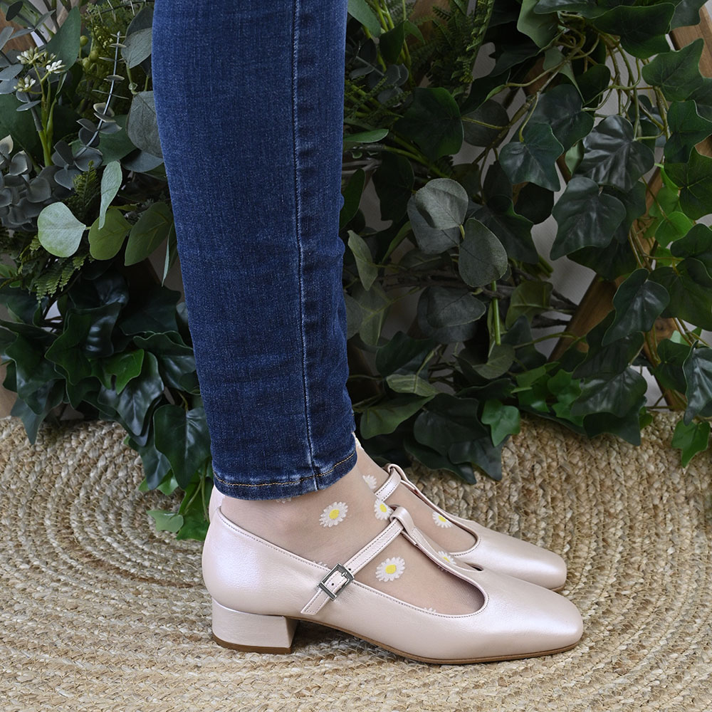 Su silueta T-strap de inspiración clásica se reinventa a través de una puntera cuadrada de aire contemporáneo, creando un equilibrio perfecto entre la nostalgia y la modernidad.