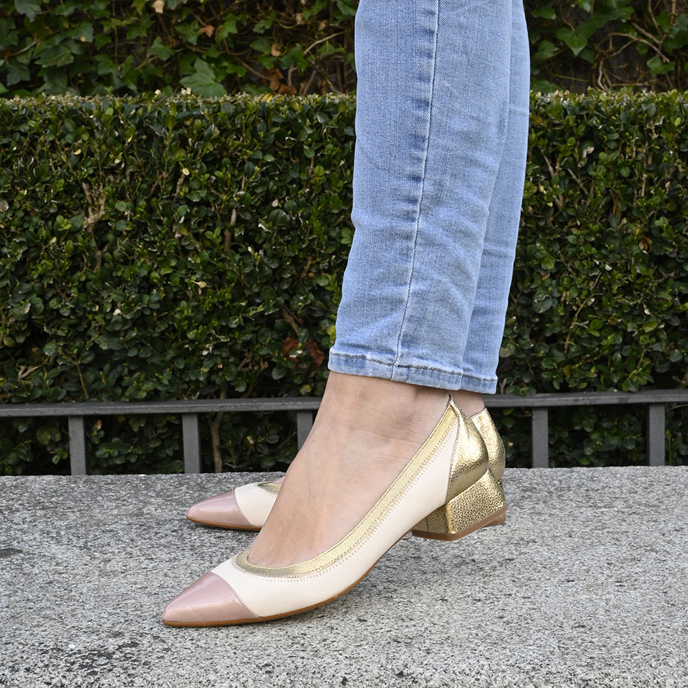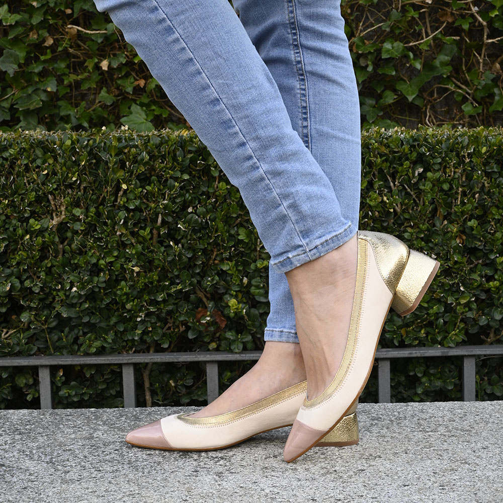 En primer lugar por la magnifica combinación de colores y texturas; ya que se trata de un zapato confeccionado en una suave piel beige teñida con tintes vegetales, en combinación con la talonera y el tacón, en piel metalizada dorada de efecto craquelado, y un toque dulce y femenino en la puntera, cubierta con piel rosa maquillaje acharolada.
