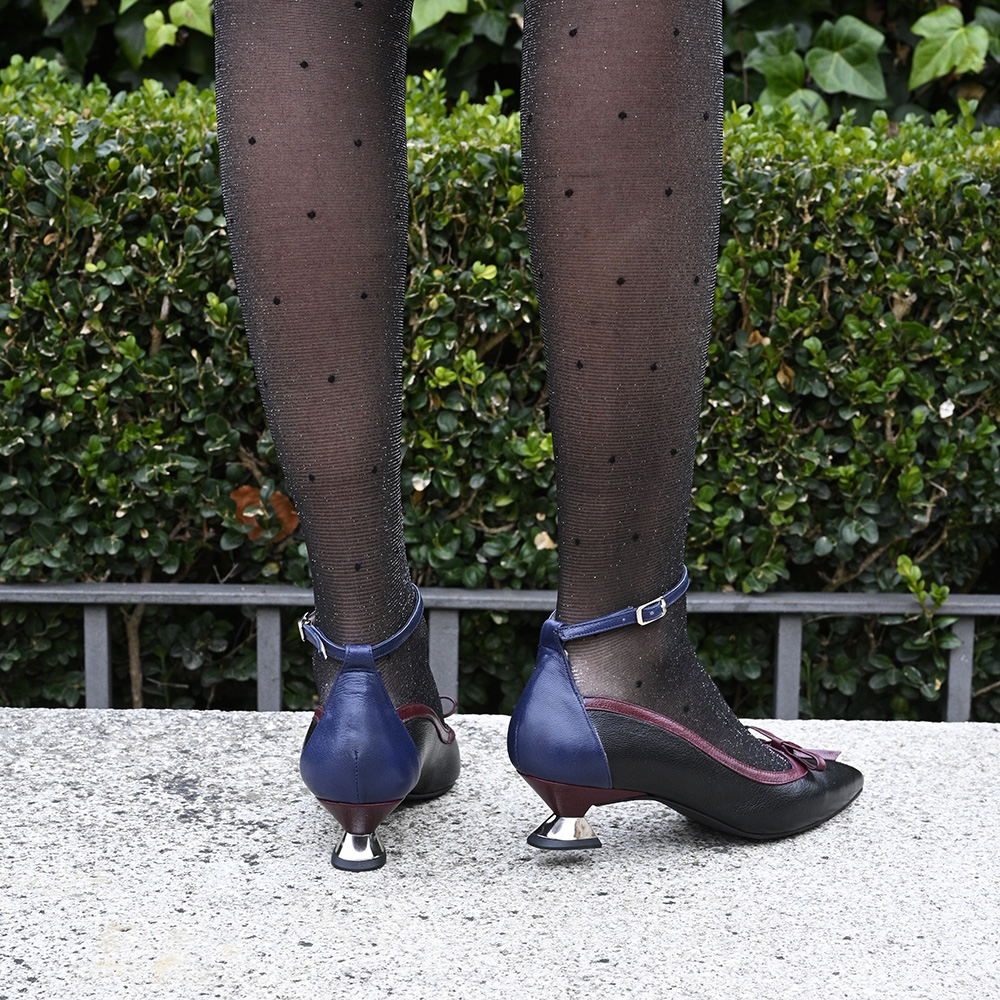 En esta ocasión el diseño Nuit, no podría ser más coqueto y versátil; confeccionado en piel napa negra con elegante acabado en punta, con un bonito escote redondeado adornado con un lazo en tono burdeos. Juega con azul marino en la talonera y ajuste al tobillo de hebilla y elástico.