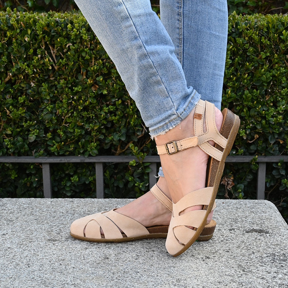 Elaboradas con piel de primera calidad en un tono beige suave que recuerda a la arcilla secada al sol, las sandalias Tellus son más que un calzado; son una invitación a explorar el mundo con comodidad y estilo. El diseño de la puntera cerrada con aberturas transversales ofrece una ventilación natural y un ajuste envolvente, mientras que la correa ajustable con hebilla metálica de aspecto envejecido asegura un ajuste perfecto y personalizado.