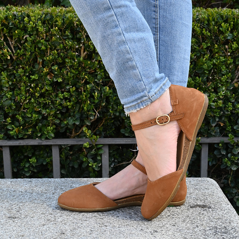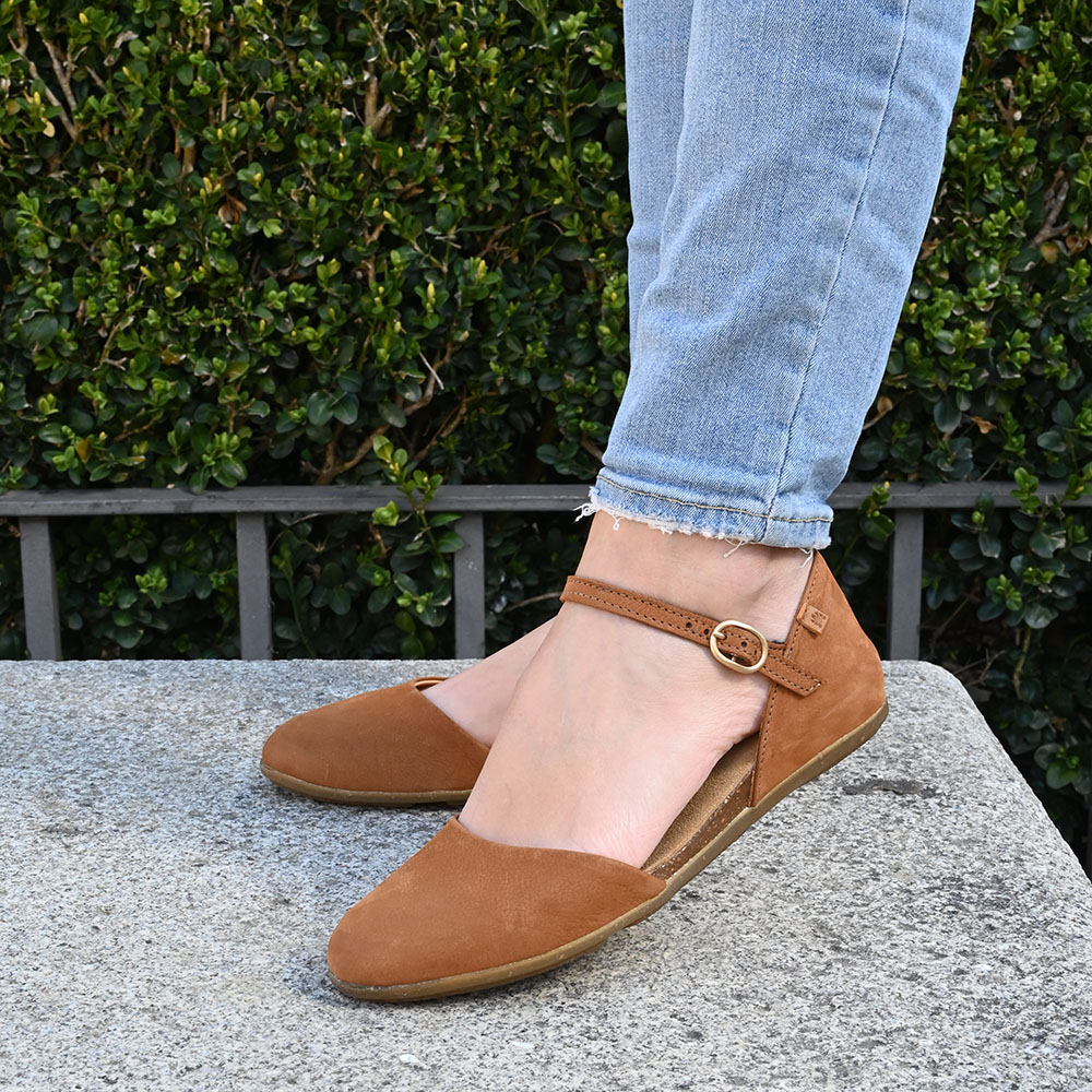 Confeccionada en una piel de primera calidad, su color cuero rico y profundo evoca la tierra fértil tras la lluvia y la corteza de los árboles centenarios. El diseño envolvente de su puntera cerrada ofrece la protección de un zapato pero con la libertad de una sandalia, permitiendo que tu pie respire mientras avanza con seguridad.